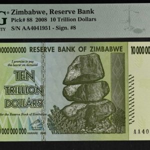 Lot 7: Zimbabwe: Reserve Bank 10 Trillion Dollars of 2008 PMG Graded Choice Uncirculated 66 EPQ. Pick # 88. S/N: AA 4041951. Brilliant uncirculated. زيمبابوي: البنك الاحتياطي 10 تريليون دولار لعام 2008 من PMG متدرج الاختيار غير متداول 66 EPQ. الاختيار رقم 88 الرقم التسلسلي: أأ 4041951. رائعة غير متداولة.