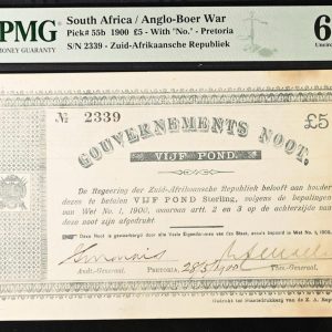 Lot 8: South Africa: Anglo Boer War Issues: ZAR VIJF Pond “Pretoria” Gouvernements Noot of 1900 PMG Graded 62 Uncirculated.