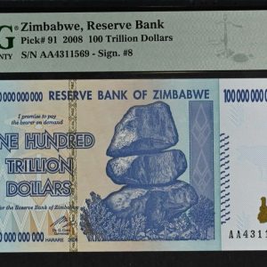 Lot 8: Zimbabwe: Reserve Bank 100 Trillion Dollars of 2008 PMG Graded Choice Uncirculated 65 EPQ. Pick # 91 S/N: AA 4311569. Brilliant uncirculated. زيمبابوي: البنك الاحتياطي 100 تريليون دولار لعام 2008 من PMG متدرج الاختيار غير متداول 65 EPQ. اختر رقم 91 الرقم التسلسلي: أأ 4311569. رائعة غير متداولة.