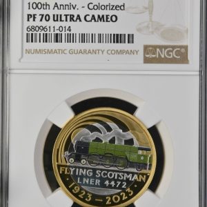 Lot 9: Great Britain: Charles III gilt-silver proof colorized “Flying Scotsman” 2 Pounds of 2023 Proof 70 NGC.
