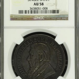 Lot 9: South Africa: Paul Kruger ZAR Silver 5 Shillings (Crown) “Single Shaft” of 1892 AU 58 NGC