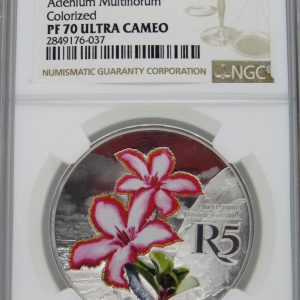 Lot 22: South Africa: Republic “Adenium Multiflorum” (Impala Lily) Colourized R5 (1oz Silver) of 2019 PF 70 NGC