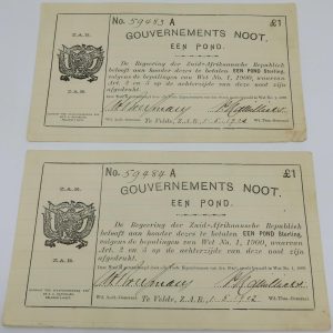 Lot 23: South Africa: Anglo Boer War Issues: Consecutive Pair of ZAR EEN Pond “Te Velde” Gouvernements Noot of 1902.