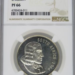 Lot 17: South Africa: Republic Silver R1 Alternate Language “English” of 1966 Proof 66 NGC.