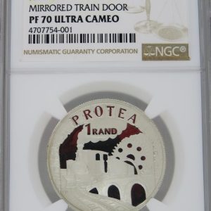 Lot 21: South Africa: Republic Silver R1 “Railway Centennial – Mirrored Train Door” of 1995 Proof 70 NGC.