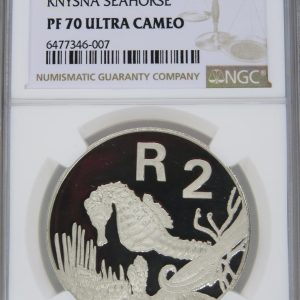Lot 22: South Africa: Republic Silver R2 “Knysna Sea Horse” of 1997 Proof 70 NGC.