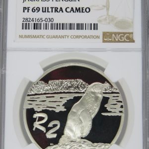 Lot 23: South Africa: Republic Silver R2 “Jackass Penguinn” of 1998 Proof 69 NGC.