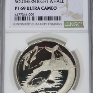 Lot 23: South Africa: Republic Silver R2 “Southern Right Wale” of 2002 Proof 69 NGC.