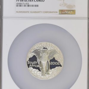 Lot 24: South Africa: Republic Silver 50 Cents “Elephant” 2oz Silver of 2002 Proof 68 NGC.