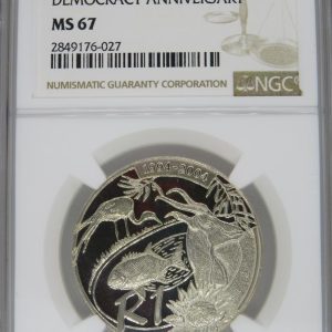 Lot 39: South Africa: Republic Protea R1 Silver “Democracy Anniversary” of 2004 MS 67 NGC.