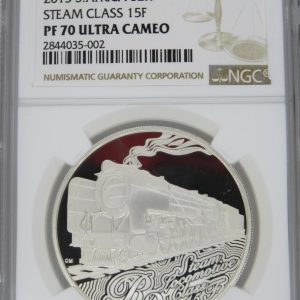 Lot 43: South Africa: Republic Silver R2 “Trains of South Africa – Steam Class 15F” of 2015 Proof 70 NGC.
