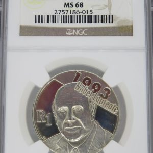 Lot 28: South Africa: Republic Protea Silver R1 “FW de Klerk” of 2007 MS 68 NGC.