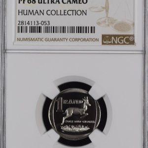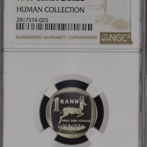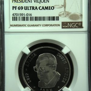 Lot 28: South Africa: Republic nickel R1 “President Viljoen” of 1985 Proof 69 NGC.