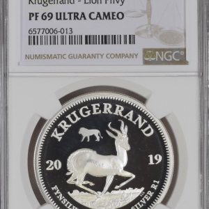 Lot 37: South Africa: Republic Silver Krugerrand 1oz Silver “Lion Privy” mintmark of 2019 Proof 69 NGC.