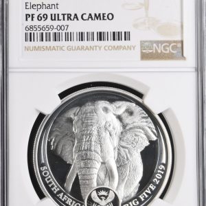 Lot 38: South Africa: Republic Silver R5 “Big 5 – Elephant” of 2019 Proof 69 NGC.