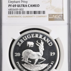 Lot 39: South Africa: Republic Silver Krugerrand 1oz Silver “Elephant Privy” mintmark of 2019 Proof 69 NGC.