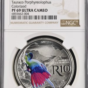 Lot 40: South Africa: Republic “Tauraco Porphyreolophus” (Purple-crested Turaco) Kruger-Canyons Biospere Colourized R10 (1oz Silver) of 2019 Proof 69 NGC.
