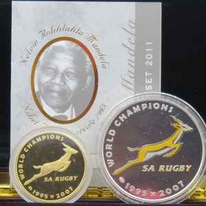 Lot 49: Nelson Mandela SA Rugby Set of 2011. 1/2oz Gold 24 Carat & 1oz Silver. In original box with certificate.