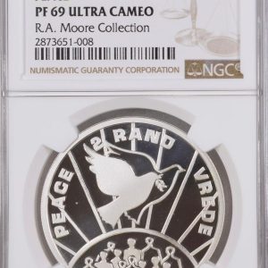 Lot 40: South Africa: Republic Silver R2 “Peace” of 1993 Proof 69 NGC.