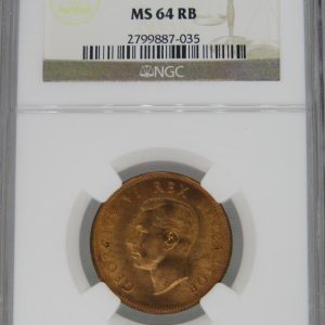 Lot 5: South Africa: Union George VI bronze quarter penny (farthing) of 1947 MS 64 Red & Brown NGC.