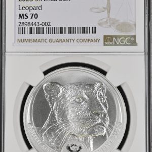 Lot 44: South Africa: Republic Silver R5 “Big 5 Series II – Leopard” of 2023 MS 70 NGC.