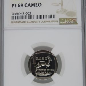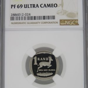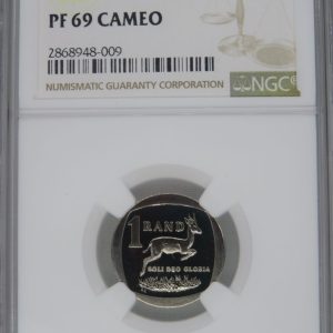 Lot 28: South Africa: Republic nickel plated copper R1 of 2019 Proof 69 Cameo NGC.
