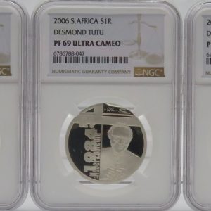 Lot 38: South Africa: Lot of 3 x Republic Desmond Tutu R1 Silver of 2006 PF 69 NGC.