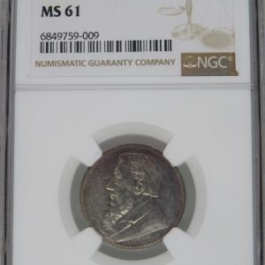 Lot 8: South Africa: Paul Kruger ZAR silver One Shilling of 1897 MS 61 NGC.