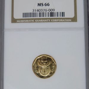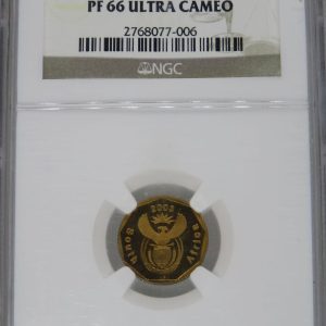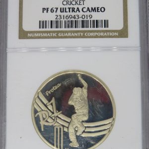 Lot 34: South Africa: Republic Protea Silver R1 “Cricket” of 2003 Proof 67 Ultra Cameo NGC.