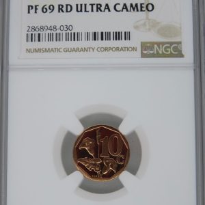 Lot 29: South Africa: Republic bronze plated steel 10 cents of 2011 Proof 69 Ultra Cameo NGC.