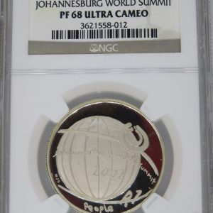 Lot 32: South Africa: Republic Protea Silver R1 “Johannesburg World Summit” of 2002 Proof 68 Ultra Cameo NGC