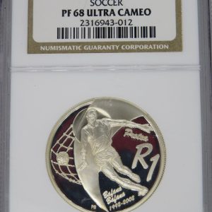 Lot 33: South Africa: Republic Protea Silver R1 “Soccer” of 2002 Proof 68 Ultra Cameo NGC.