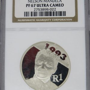 Lot 35: South Africa: Republic Protea Silver R1 “Nelson Mandela” of 2007 Proof 67 Ultra Cameo NGC.