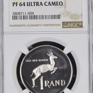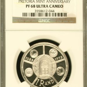 Lot 25: South Africa: Republic Silver R1 “Pretoria Mint Anniversary” of 1974 Proof 68 Ultra Cameo NGC.