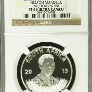 Lot 30: South Africa: Republic Protea Silver R1 “Mandela Life of a Legend – Mqhekezweni” of 2013 Proof 69 Ultra Cameo NGC.