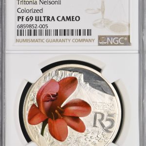 Lot 38: South Africa: Republic “Tritonia Nelsonii” (Orange Tritonia) Colourized R5 (1oz Silver) of 2018 Proof 69 Ultra Cameo NGC.