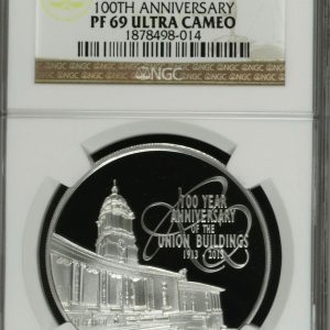 Lot 43: South Africa: Republic Silver R2 “Union Buildings 100th Anniversary” of 2012 Proof 69 Ultra Cameo NGC.