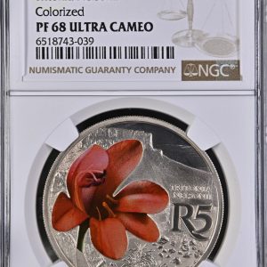 Lot 45: South Africa: Republic “Tritonia Nelsonii” (Orange Tritonia) Colourized R5 (1oz Silver) of 2018 Proof 68 Ultra Cameo NGC.
