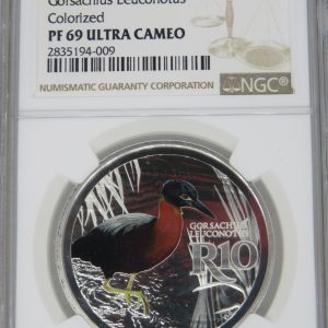 Lot 46: South Africa: Republic “Gorsachius Leuconotus” (White-Backed Night Heron) Colourized R10 (1oz Silver) of 2018 Proof 69 Ultra Cameo NGC