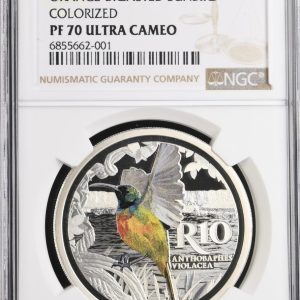 Lot 8: South Africa: Republic Silver Colourised R10 “Orange – Breasted Sunbird” of 2016 Proof 70 NGC.