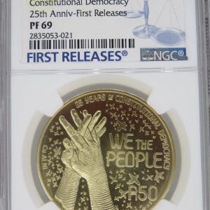 Lot 83: South Africa: Republic Cu/Ni R50 “Constitutional Democracy Series 25th Anniversary” of 2019 Proof 69 NGC.