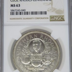 Lot 89: Southern Rhodesia: Cecil Rhodes Centennial Crown of 1953 MS 63 NGC.