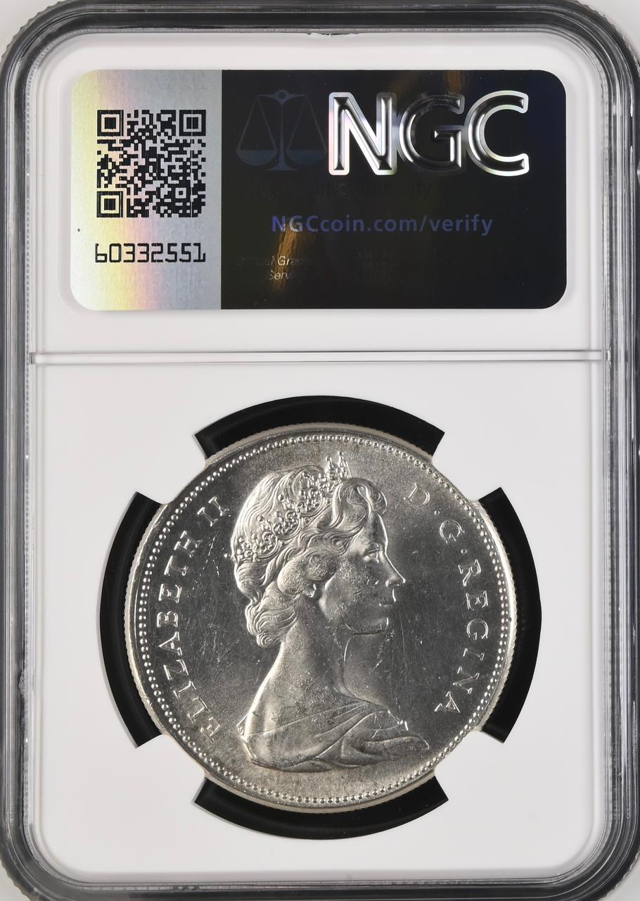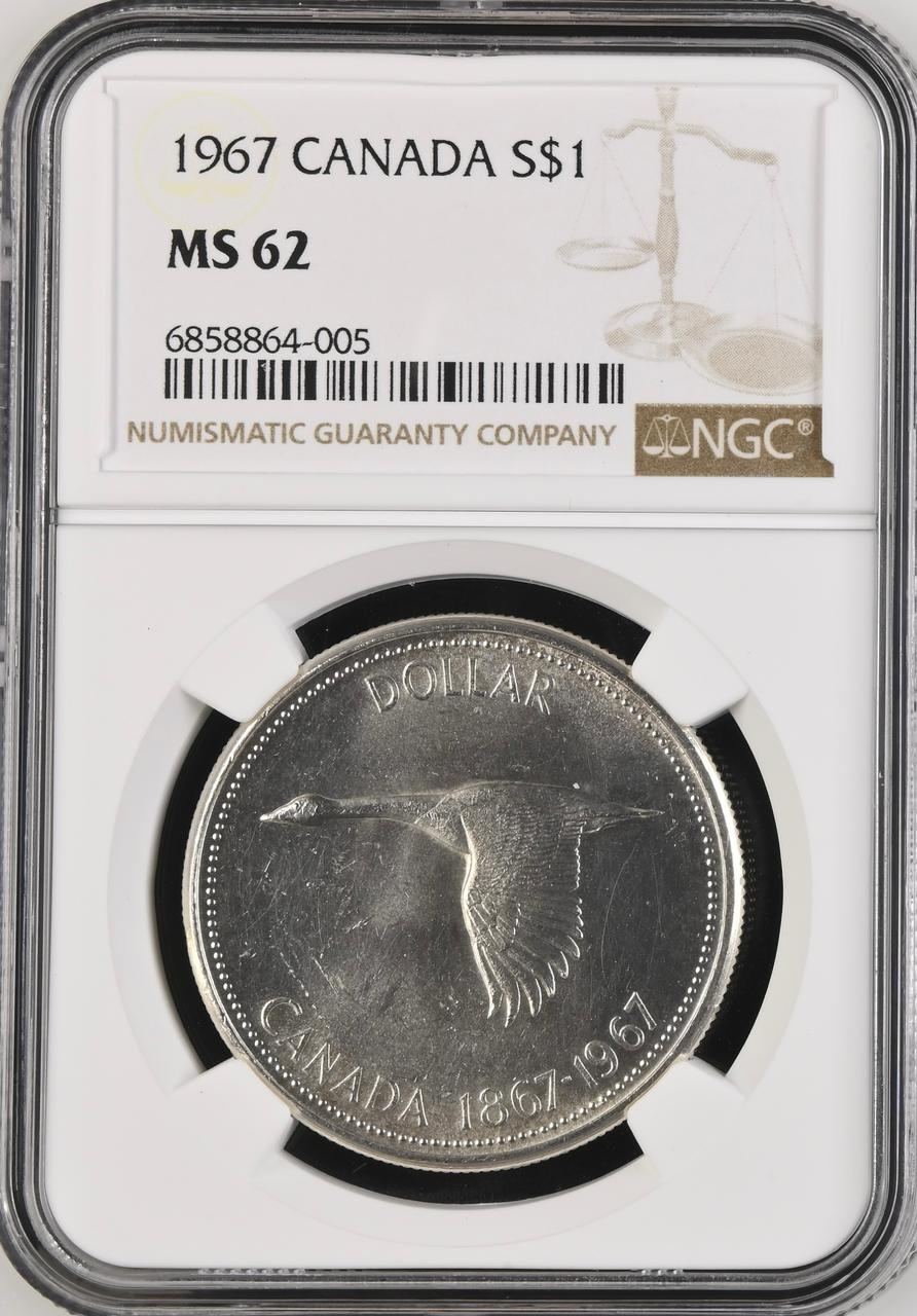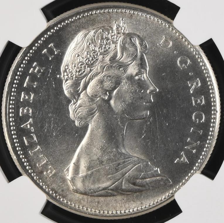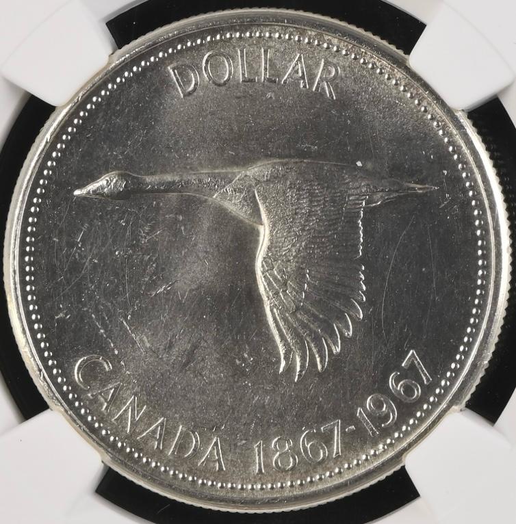 Lot 1: Canada: Elizabeth II Silver Dollar (100th Anniversary 1867-1967) of 1967 MS 62 NGC. Mintage: 6 767 496 Perfect uncirculated. Sold @ R400.
