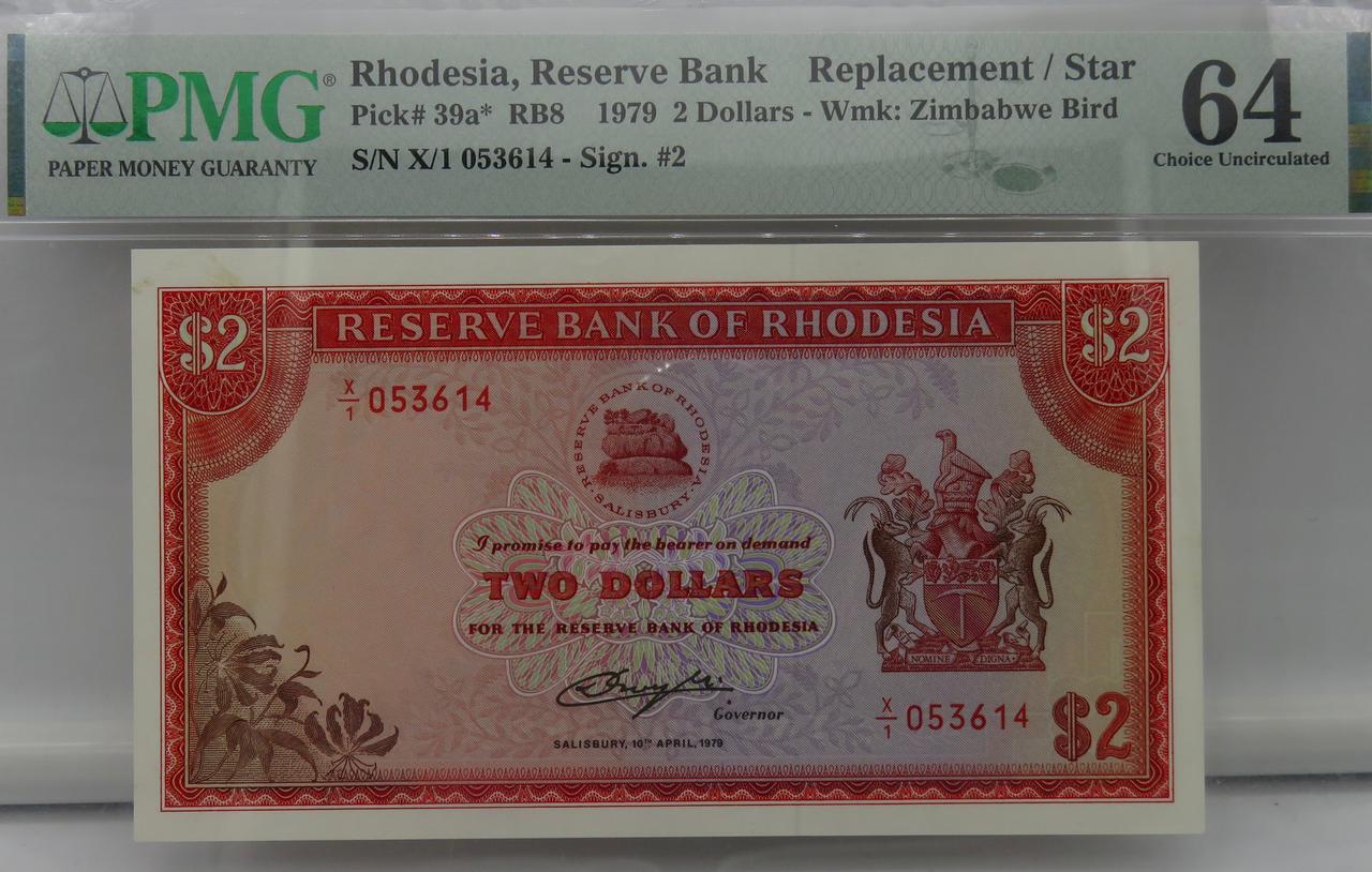 Lot 1: Rhodesia: Reserve Bank of Rhodesia Two Dollars Replacement Note of 1979 PMG Graded 64 Choice