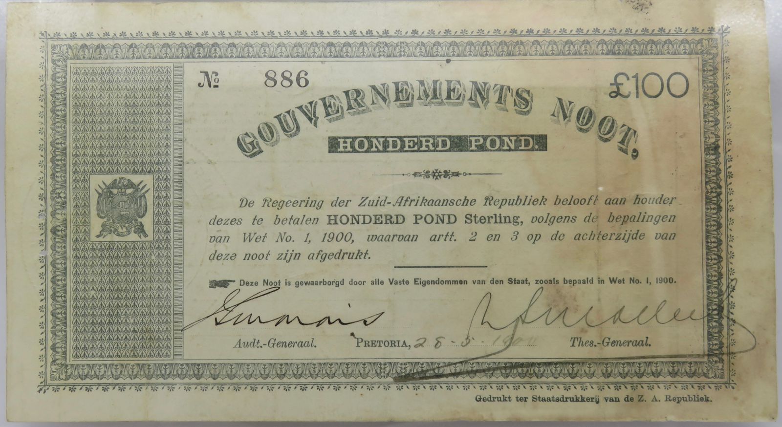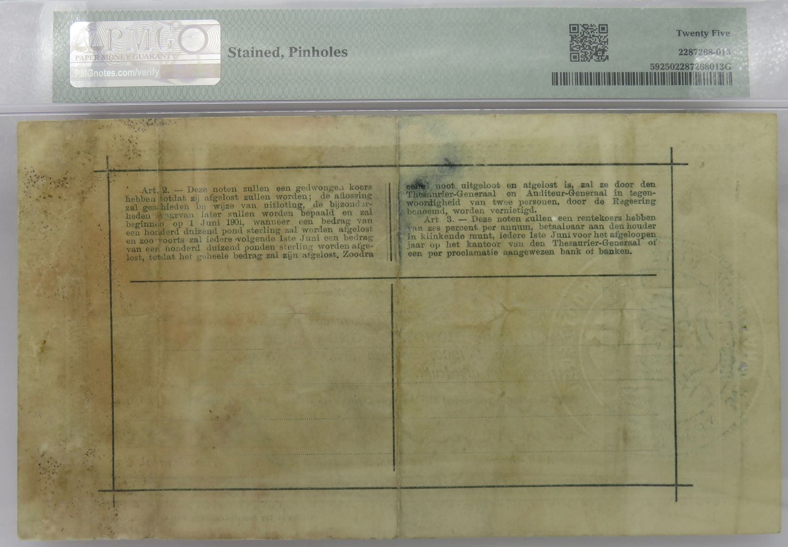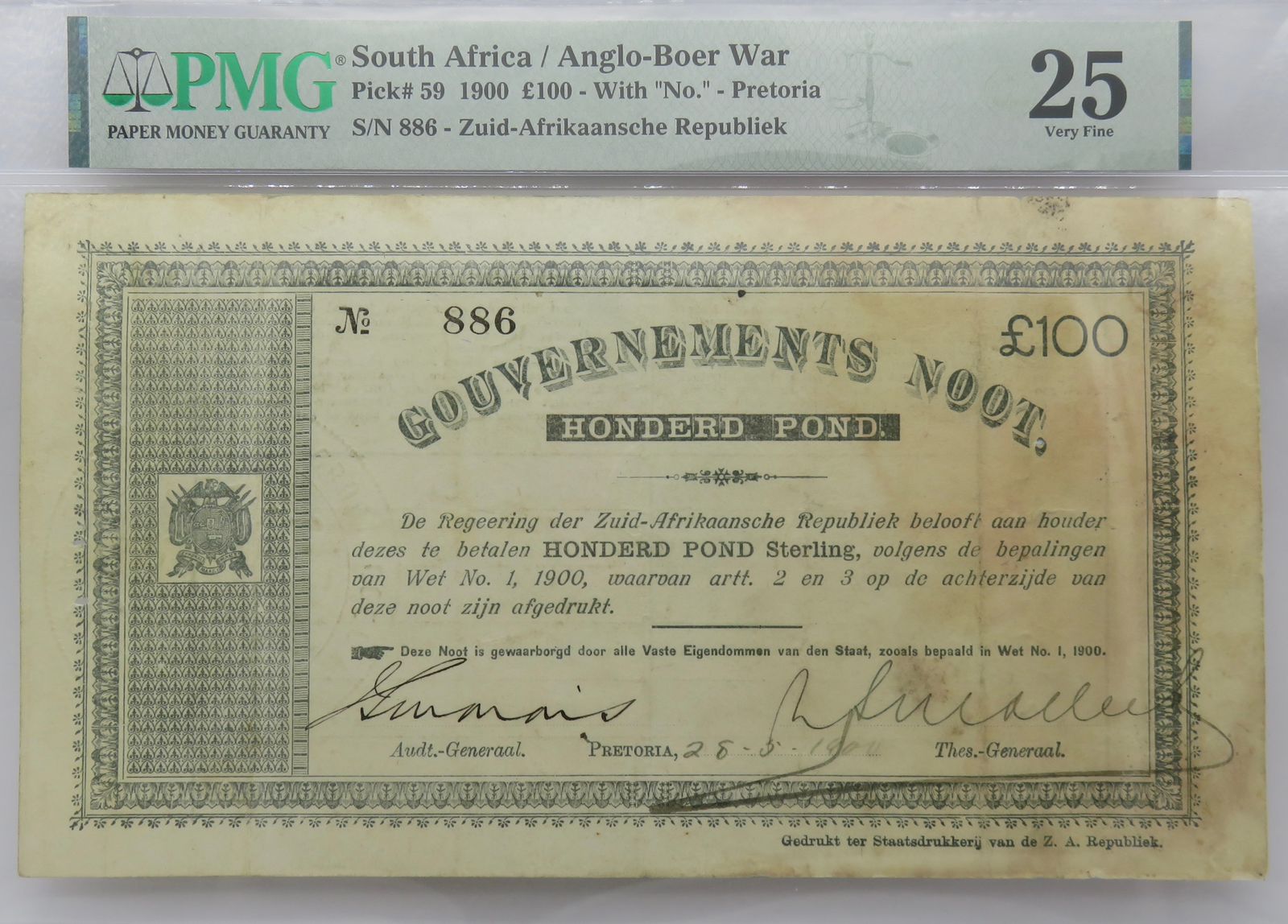 Lot 10: South Africa: Anglo Boer War Issues: ZAR HONDERD Pond “Pretoria” Gouvernements Noot of 1900 PMG Graded Very Fine 25.
