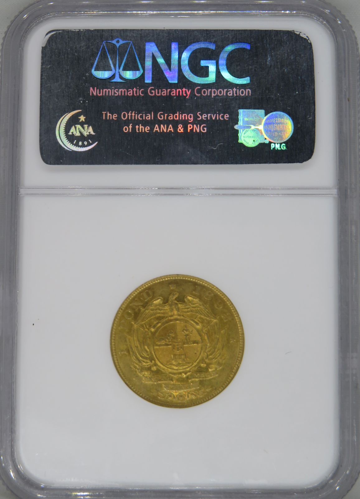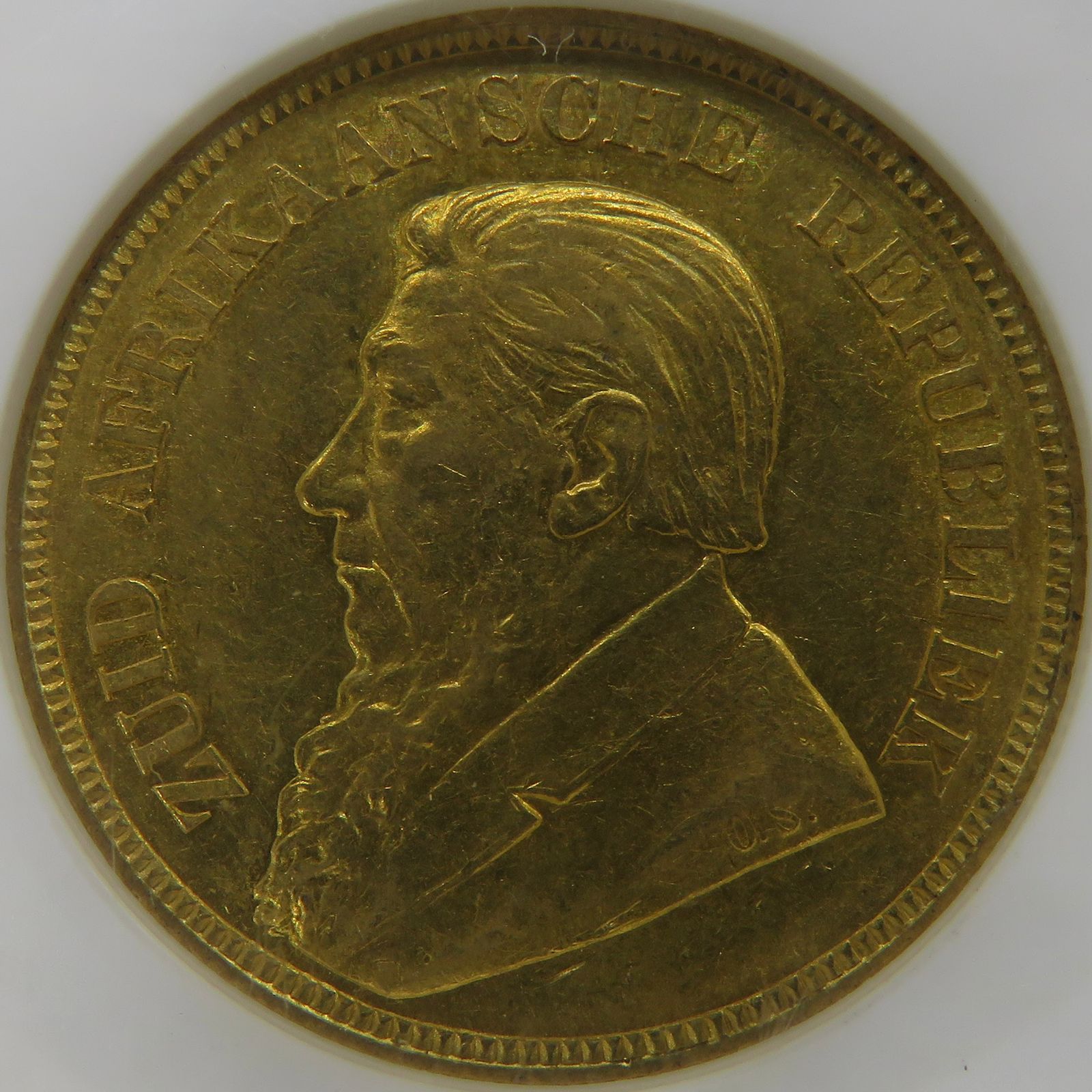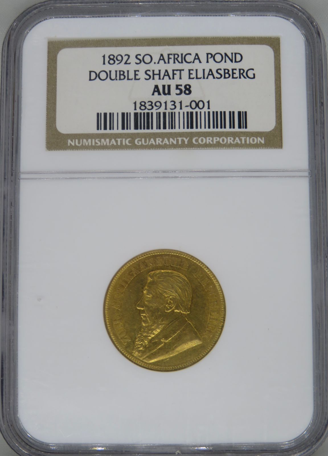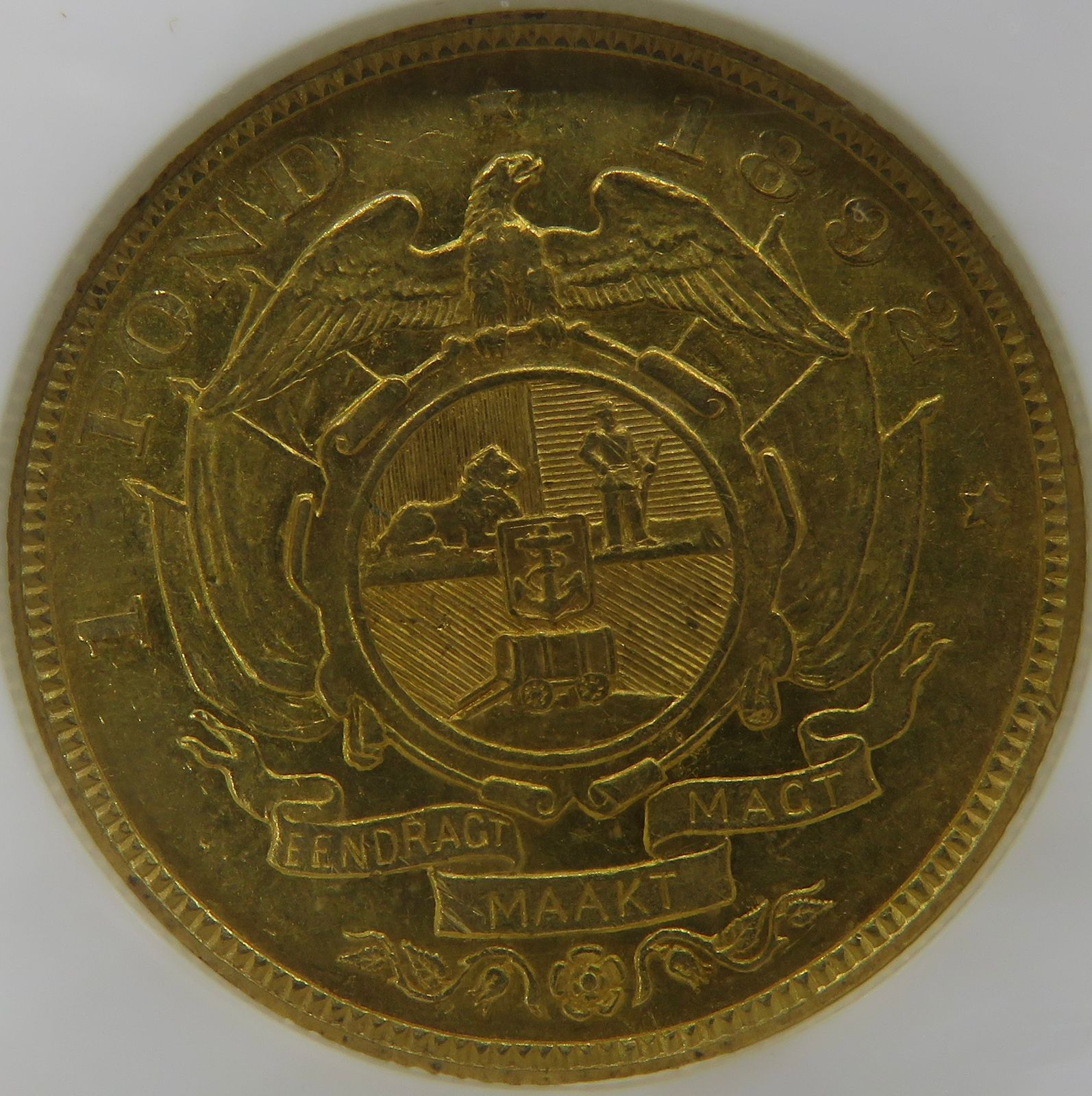 South Africa: Paul Kruger ZAR gold Pond “Double Shaft” of 1892 AU 58 NGC.