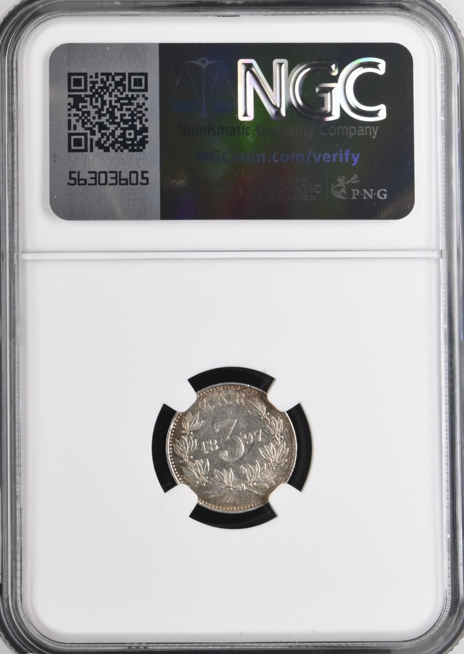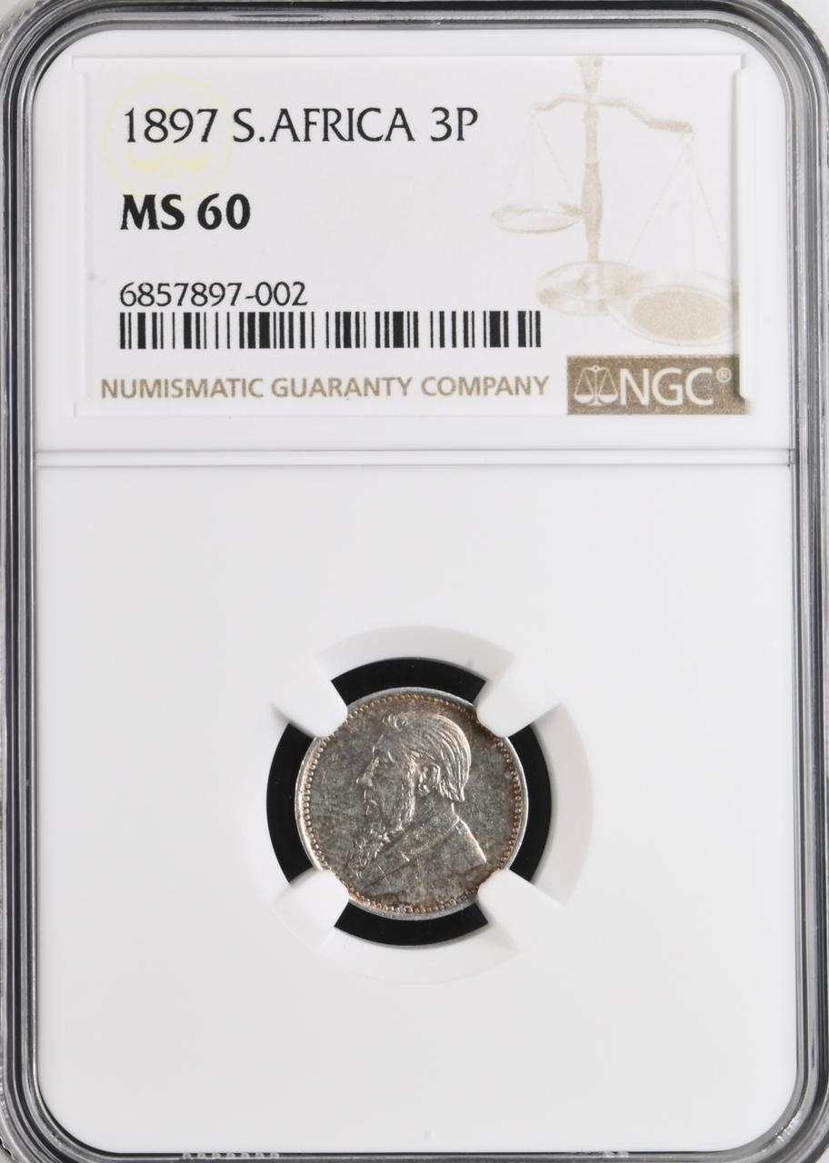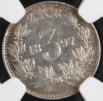 Lot 10: South Africa: Paul Kruger ZAR Silver 3 Pence of 1897 MS 60 NGC. Mintage: 200 600. Perfect uncirculated. Hern’s Price UNC: R2,000. Sold @ R800.