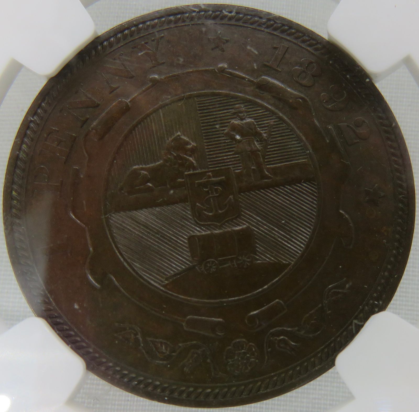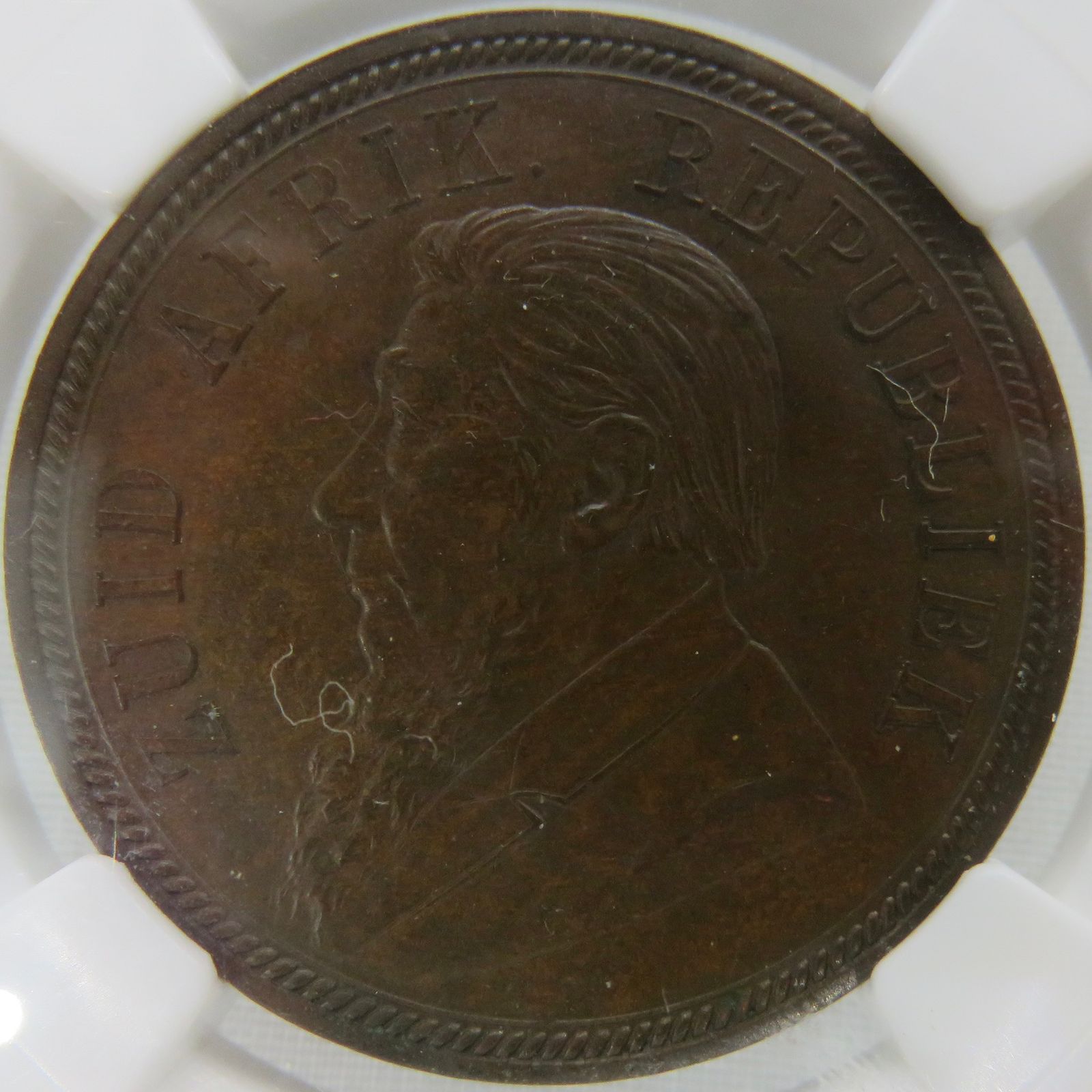 Lot 11: South Africa: Paul Kruger ZAR bronze penny of 1892 MS 62 Brown NGC. Mintage: 27 862. Perfect uncirculated. Sought after first year of strike. Sold @ R1,500.