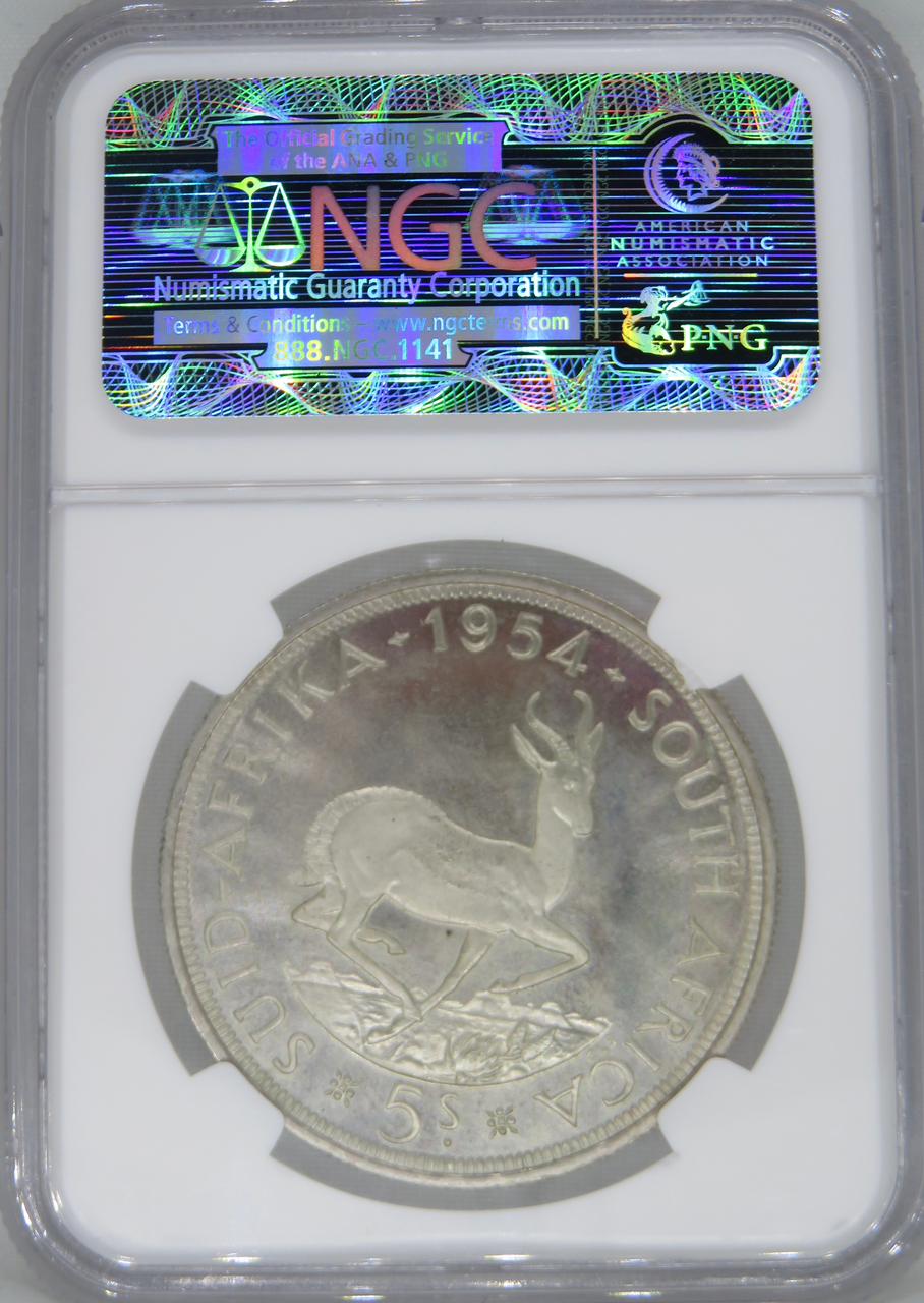 South Africa: Union Elizabeth II Silver 5 Shillings (Crown) of 1954 PL 65 NGC.