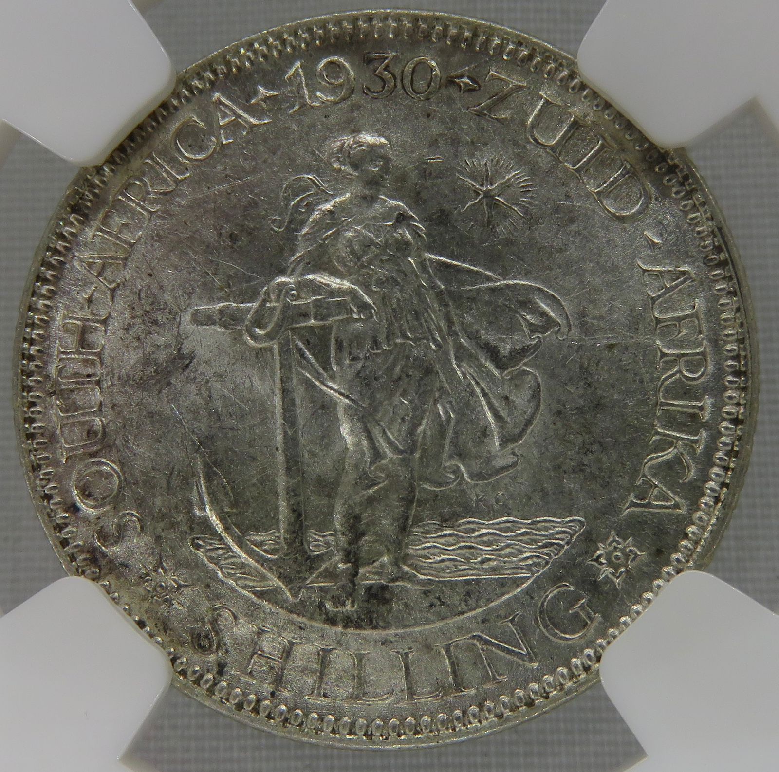 South Africa: Union George V silver One Shilling of 1930 MS 62 NGC.